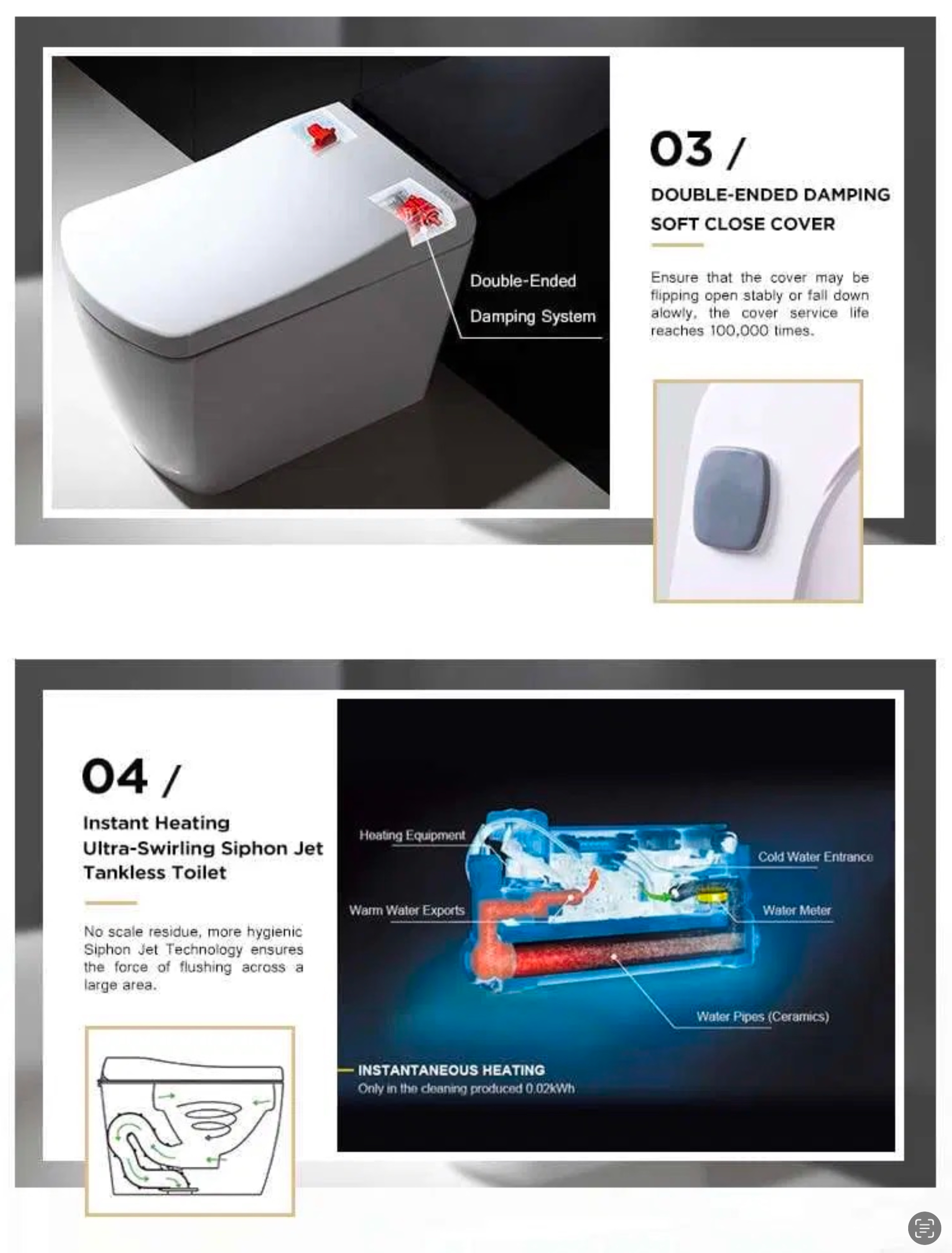 The toilet lid opens, closes, and flushes automatically, eliminating the need to touch anything and enhancing overall hygiene.